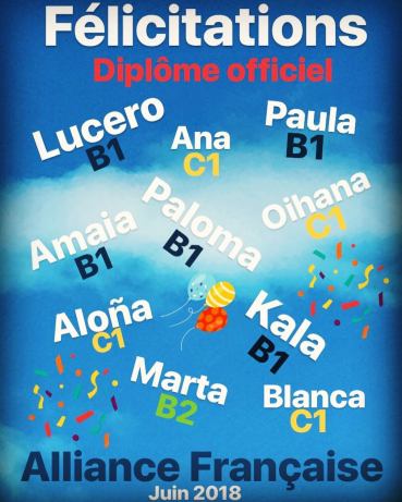 Queremos felicitar a nuestros 10 alumnos que presentaron los exámenes oficiales de la Alliance Française (una alumna presento el examen de la Escuela Oficial de Donostia) como candidatos libres y que preparamos en Academia de francés OLAFRANCE.